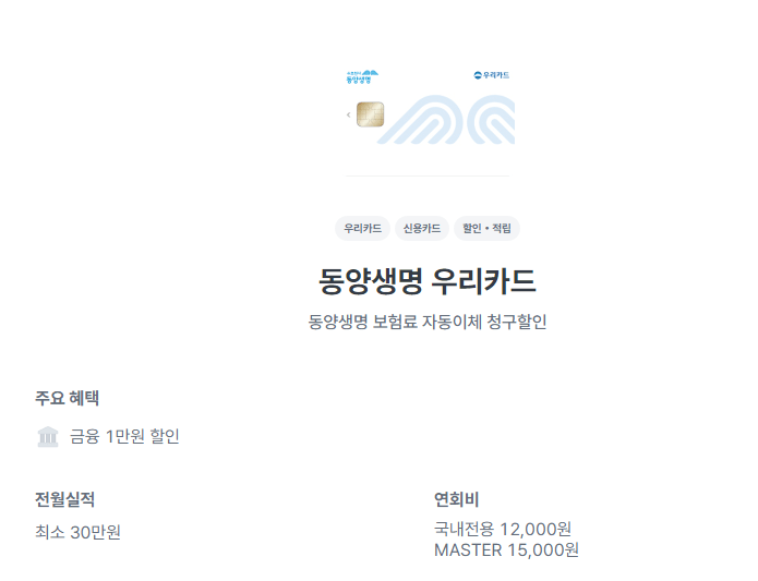 동양생명 우리카드는 동양생명 보장성 보험의 보험료 자동이체를 납부할 시 할인 헤택이 제공되는 신용카드라고 보시면 됩니다.