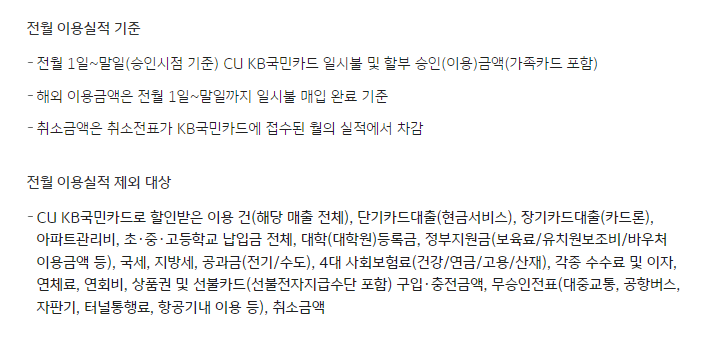 기준 : 전월 1일 ~말일의 CU KB국민카드 일시불 및 할부 승인 금액 기준