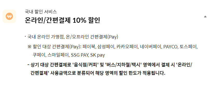 국내 온라인 가맹점과 온/ 오프라인 간편결제 시 월 통합할인 한도 내에서 1만원~ 3만 5천원까지 할인 혜택이 적용됩니다. 단, 월 통합한도 내 "영역별 한도" 제한을 두고 있다는 점을 참고 해주세요.
