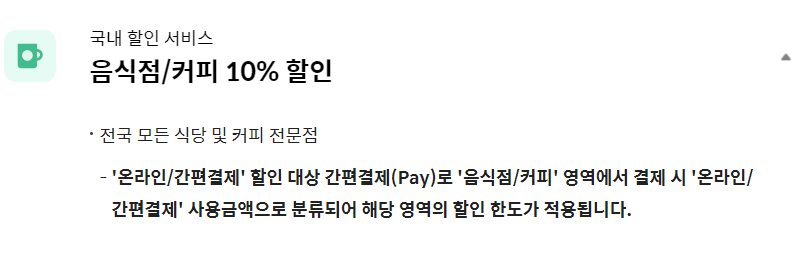 전국의 모든 식당 및 커피전문점에서 할인 혜택이 제공됩니다. 간편결제와 마찬가지로 가맹점의 폭이 넓어서 거의 할인 혜택을 받을 수 있는 카드라 추천드려요.