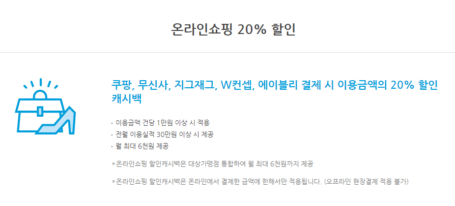 20% 할인이 제공됩니다. 간편결제(네이버페이, 카카오페이, 페이코), 온라인 쇼핑(쿠팡, 무신사, 지그재그, W컨셉트, 에이블리), 커피전문점(스타벅스, 투썸플레이스,빽다방, 컴포즈커피, 커피빈, 메가커피)