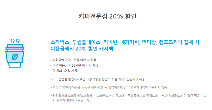 커피전문점 할인 캐시백은 대상가맹점 통합하여 월 최대 6천 원까지 제공됩니다.백화점, 할인점, 아울렛, 쇼핑몰, 공항, 호텔 등 입점매장의 경우 할인 캐시백이 적용되지 않습니다. 현장결제와 오더결제 (오더 결제는 스타벅스 사이렌오더, 투썸 플레이스 투썸오더, 커피빈 퍼플오더 만 할인됩니다) 시 할인 캐시백이 적용됩니다.
