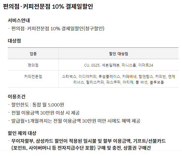 편의점과 커피 전문점에서는 사용 금액의 10%를 결제일에 청구 할인됩니다.