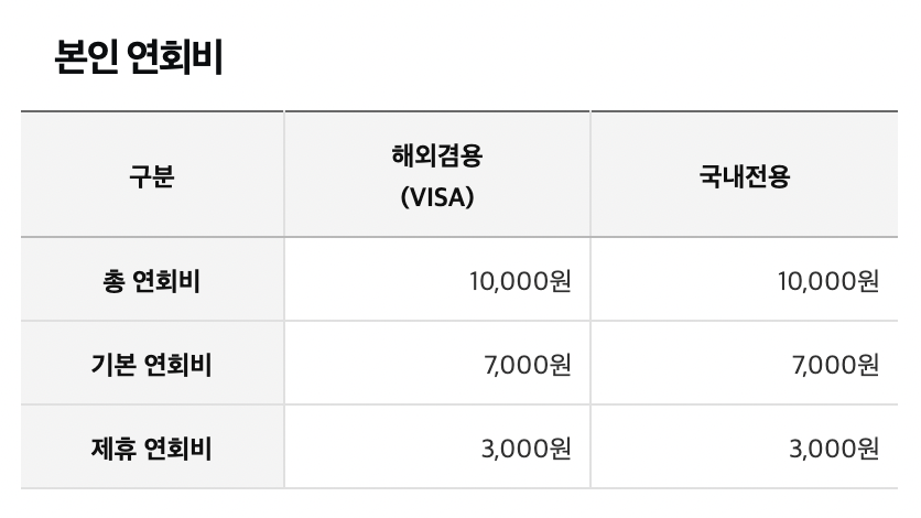 해외겸용(VISA)은 기본 연회비 7,000원, 제휴 연회비가 3,000원으로 총 연회비 10,000원이 발생하고