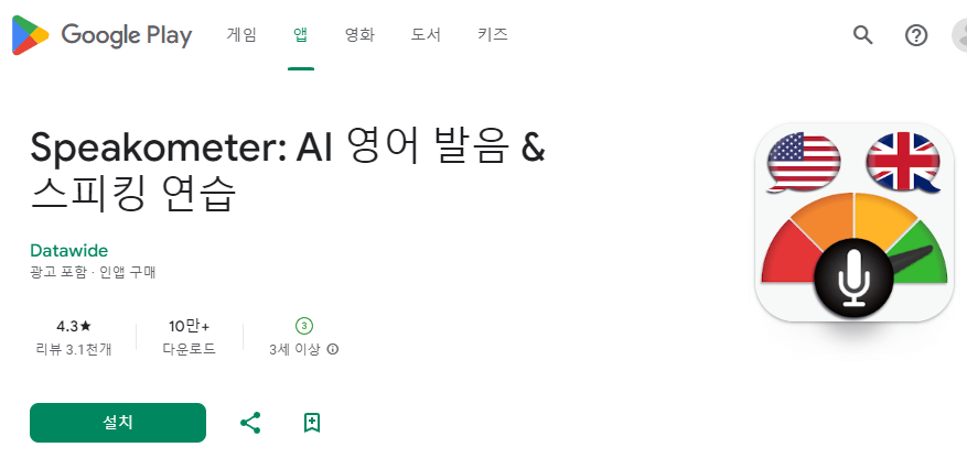 - 검색 결과에서 원하는 발음 교정 앱을 선택 하고, 설치 버튼을 눌러 다운로드합니다.