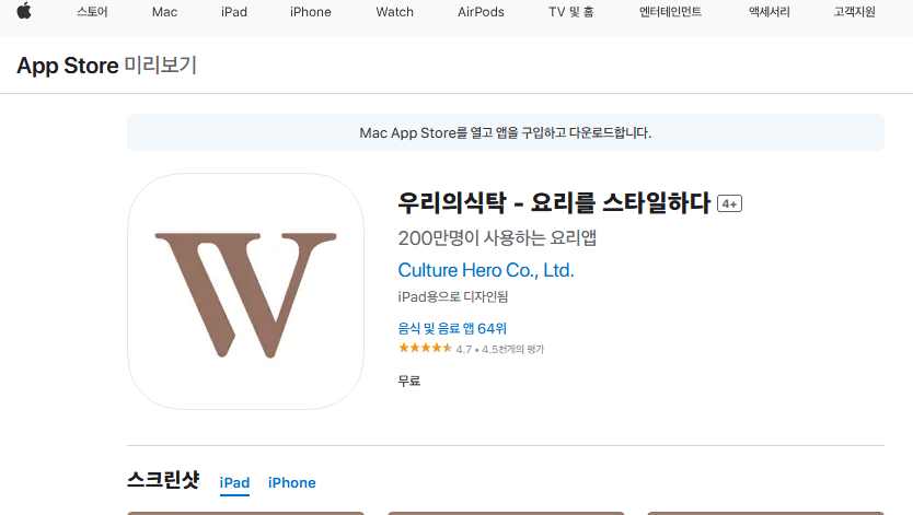 - 검색창에 우리의 식탁을 입력하여 검색합니다. 찾았다면 눌러 상세페이지를 들어가 주세요.