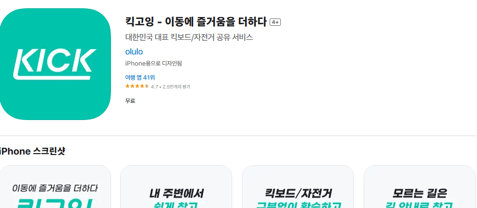 이번에 작성할 다운로드 포스팅은 킥고잉 어플입니다. 킥고잉은 자전거 및 킥보드를 공유하는 서비스로, 이동수단이 부족한 사람들은 아주 유용하게 이용할 수 있는 어플 중 하나라고 볼 수 있죠. 킥고잉으로 등/하교 혹은 출/퇴근하시는 분들도 계속해서 증가하고 있습니다.