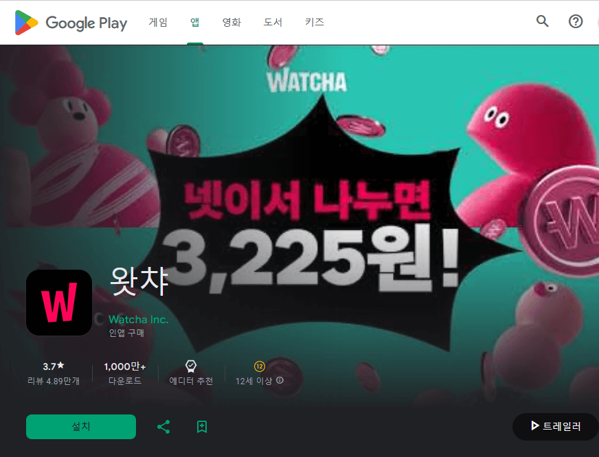- 왓챠 앱을 찾아 설치 버튼을 눌러 앱을 다운로드해주세요.