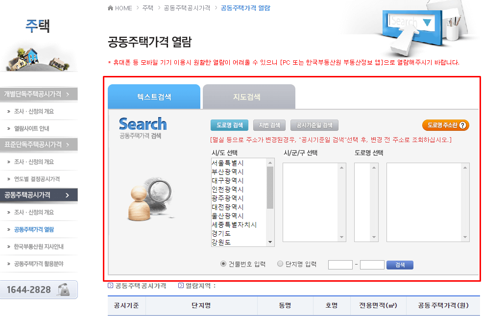 본인이 공시지가를 알고자 하는 아파트 시/도, 시/군/구, 도로명 등을 검색 등 아파트 주소를 입력하신 후 검색을 클릭하시길 바랍니다.
