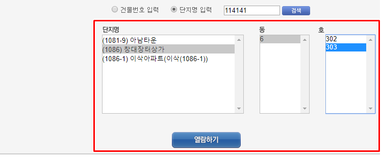 검색하기를 누르고 단지명에서 자신이 조회하고 싶은 단지명을 클릭하고 동, 호를 클릭하시고 열람하기를 눌러주시면 됩니다.