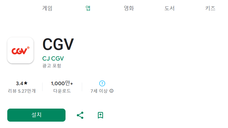 CGV 어플은 안드로이드 기준으로 구글 플레이스토어를 비롯한 다양한 스토어에서 다운로드가 가능합니다.