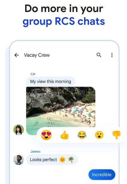 - RCS를 통해 실시간 채팅을 제공합니다. 이 기능을 통해 문자 메시지를 마치 채팅 앱처럼 주고받을 수 있으며, 메시지 읽음 표시와 실시간 입력 중 표시, 파일 전송 등을 지원합니다.