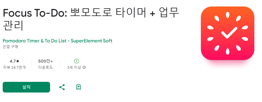 두 번째로 추천드릴 어플은 포모도로 타이머입니다. 이 어플은 포모도로 기법을 사용하여 25분 집중, 5분 휴식을 반복하며 효율적으로 시관을 관리할 수 있도록 도와주는 어플입니다.
