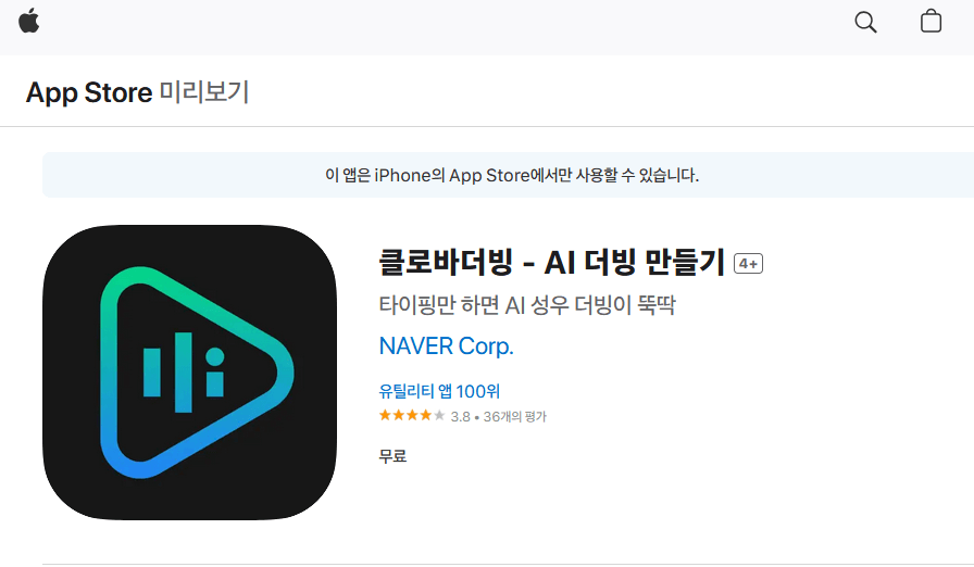 클로바더빙은 네이버에서 제공하는 어플 중 하나로, 평점은 5개 만 점 중에 3.1점을 기록하고 있습니다.