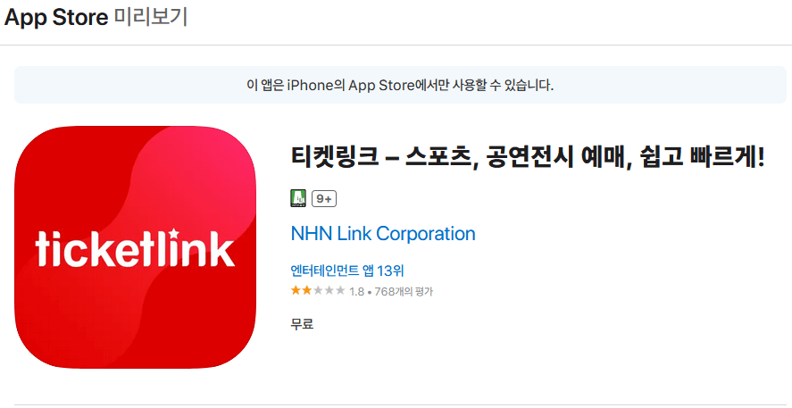 티켓링크 어플 정보