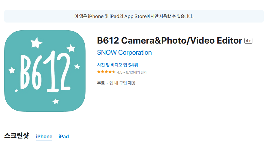 B612 어플은 앱스토어 혹은 플레이스토어에서 '사진 보정'이라고 검색을 해 보았을 때 상단에 나오는 어플입니다.