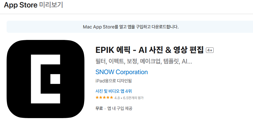 EPIK 어플 또한 플레이스토어 혹은 앱스토어에서 '사진 보정'으로 검색을 했을 시 상단에 뜨는 어플 중 하나입니다.