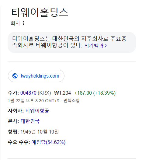 따라 티웨이항공과 아주 밀접한 관계가 있고, 모회사인데요. 이러한 이유로 인해서 주식 시장에서는 티웨이항공 테마주로 분류가 되고 있죠.