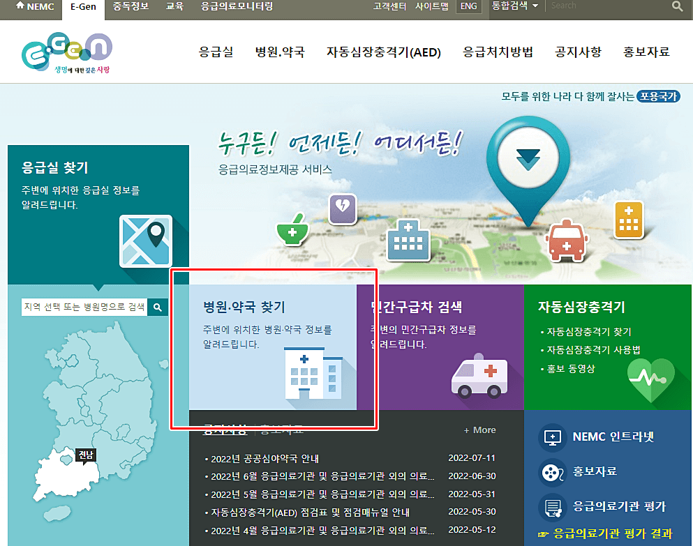 홈페이지에 들어오면 다음과 같을텐데 다양한 메뉴중 병원·약국 찾기를 클릭해주시길 바랍니다.