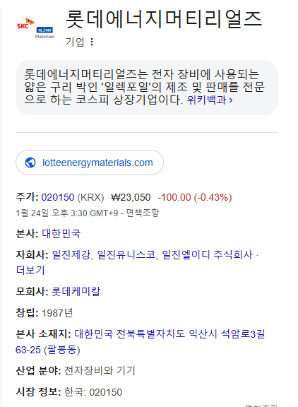 롯데그룹의 계열사로서 친환경 에너지 및 배터리 산업의 성장과 함께 급격한 성장이 기대되는 기업 중 하나죠.
