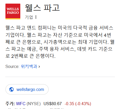 웰스파고는 금융 및 은행 지주회사로서, 다각적인 금융 서비스들을 제공하고 있는 금융 회사라고 생각을 하시면 됩니다.