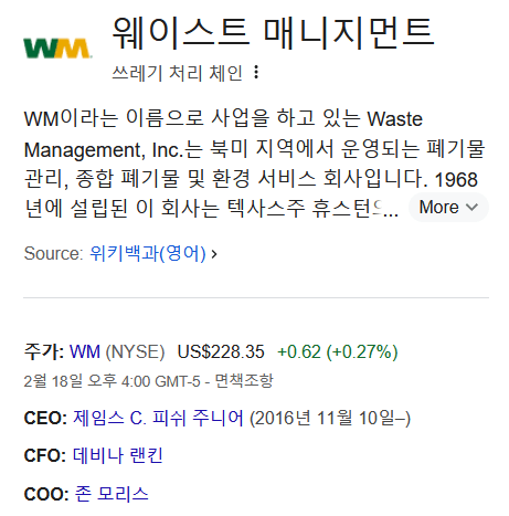 웨이스트 매니지먼트는 미국 1위 폐기물 처리업체로 캐나다와 미국에서 폐기물을 처리 및 수집과 재활용을 하는 기업입니다.