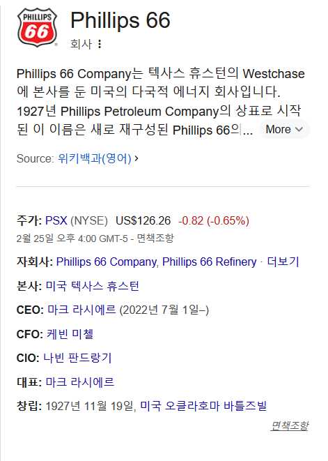 마지막으로 미국 석유 및 원유 관련주로는 필립스 66이 있습니다.
