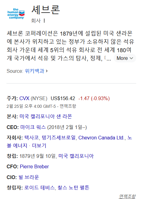 쉐브론은 미국 석유 관련주로, 미국에 본사를 둔 석유 천연가스 관련 기업입니다.