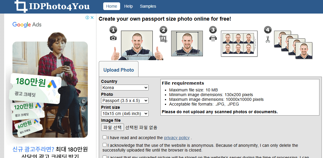IdPhoto4 You 사이트는 대표적인 증명사진 편집 사이트 중 하나입니다.
