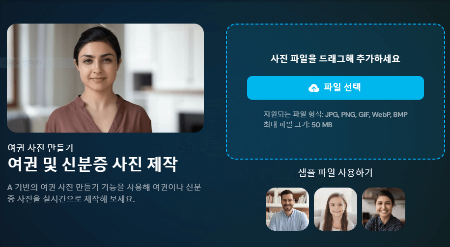 여권 사진 제작 기능으로는 PNG, WebP, JPG, BMP 포맷의 사진을 출력해보실 수 있습니다.