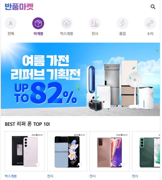 박스 개봉과 미개봉 그리고 흠집, 전시 등의 카테고리로 보기 쉽게 정리해 놓은 리퍼 전문 사이트죠.