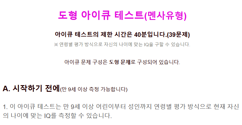 - 무료 아이큐 테스트를 통하여 멘사 등 공식 테스트 준비에 도움을 받아보실 수 있음