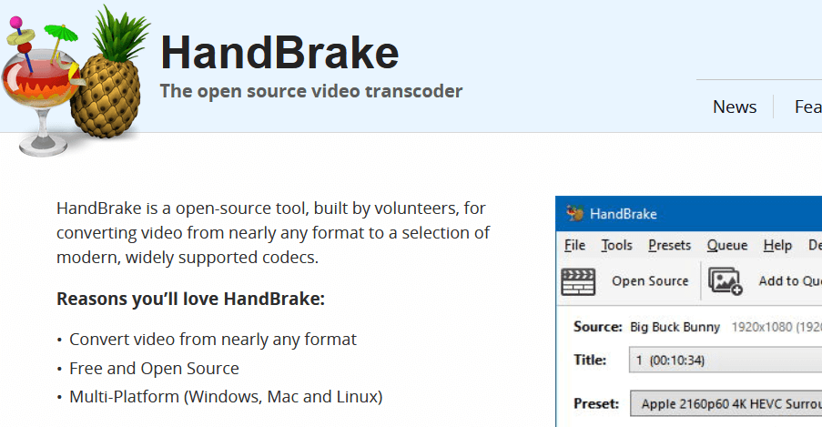 Hand Brake 사이트는 오픈 소스 비디오 변환기 중 하나로, 다양한 형식들의 비디오 파일들을 다른 형식으로 변환시킬 수 있어요.